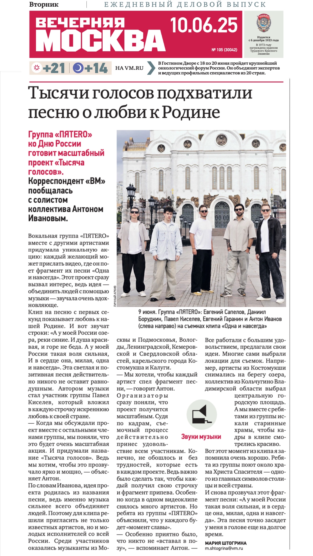 Солист группы ПЯТЕRО Антон Иванов дал интервью газете «Вечерняя Москва» и рассказал про акцию «Тысяча голосов», в которой артисты из восьми регионов России совместно исполнили песню «Одна и навсегда» (муз. П. Киселев/сл. М. Воробьева)